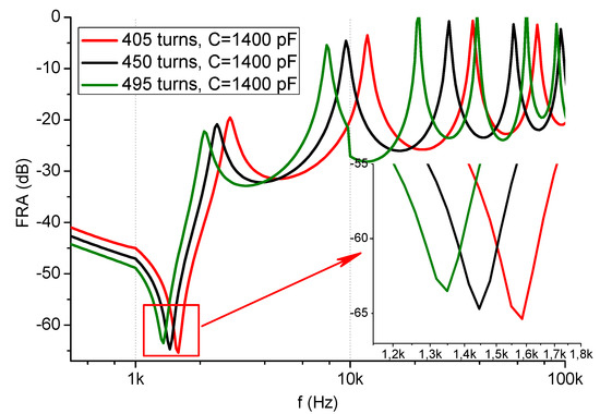 The FEM models have been prepared for the three abovementioned cases: the neutral position is 450 turns, the upper position is 495 turns, and the lower position is 405 turns. In the beginning, the capacitance value in the model was assumed to be C = 1400 pF. This value refers to the bushing capacitance, connected parallel to the winding-tank (core) capacitance. Even though the bushing capacitance is dominant, the other one was also evaluated using Maxwell. The analysis of bushing influence of FR curve can be found in the literature [26], where changes are visible in the high frequency range. Authors’ experiments show that the FR of a transformer changes in the LF range (up to 10 kHz) after connecting additional capacitance to the bushing in the other phase rather than the tested one, and in this way modifying the total capacitance of the object [9], which will be presented in Section 4. The results of the modeled frequency response are given in Figure 6.