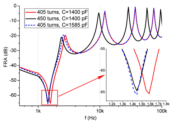 Although all resulting parameters R, L, and C differ in the described three models, the inductance changes are dominant for the frequency response at low and middle frequencies. It can be seen that inductance changes influence the whole simulated frequency range, including the first parallel resonance (approximately 2 kHz). FR curve is shifted towards higher frequencies with decrease in number of turns, and toward lower frequencies with increase in the whole frequency range. This effect was expected. In the next step, there the change of bushing capacitance on opposite winding was simulated, which allowed the position of the first resonance resulting from inductance change to be balanced. The results are given in Figure 7.