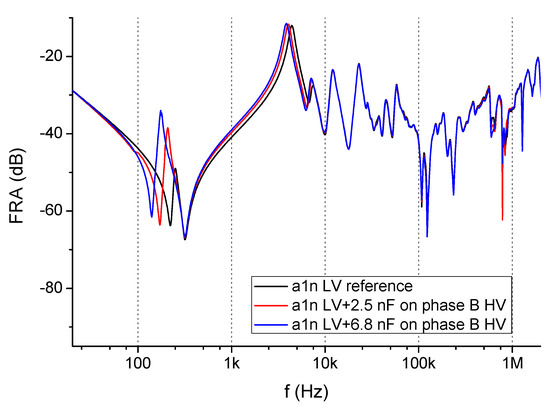 A similar effect is obtained if measurement is conducted on the LV winding of phase A, with capacitors attached to the HV phase B. The capacitive influence of the active part (even though it is in the other phase and in the other voltage side) is reduced in the MF range. The first resonance shifts in a range of 100–300 Hz, while differences between curves disappear from approximately 8 kHz. It can be seen in Figure 10.