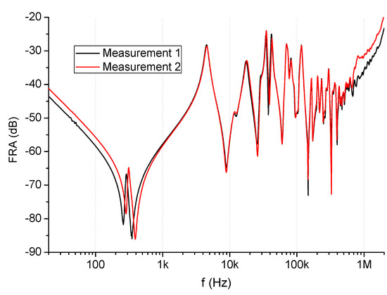 The abovementioned results show that the influence of inductance changes can be observed in the wide frequency range, including LF. If this is the only cause of changed FR measurement, it should be easy to detect. However, if these results were to be combined with capacitance changes, such as for modeling results shown in Figure 7 and Figure 8, the outcome would be difficult to properly interpret. Such a transformer would possibly be described as faulty, while visible changes may be the result of the wrong tap position combined with some capacitive changes on the bushing of different phases than those measured. Yet another problem is core magnetization, which influences only LF range. An example of such a measurement is given in Figure 13.