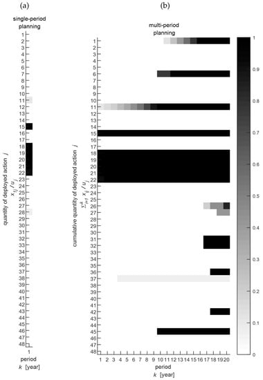 Figure 1 compactly reports the results of the planning problem in terms of retrofit actions in the case of initial investment budget = 30,000.00 (€) for both single- and multi-period (with K = 20 years) setting. Figure 1a shows the quantities of actions to be deployed normalized with respect to the application potentials. Conversely, Figure 1b shows the cumulative quantities of actions to be deployed, normalized with respect to the application potentials over the planning horizon. As expected, from Figure 1 it is evident that using a multi-period planning approach is more convenient than the single-period approach. In fact, after the initial investment, the subsequent savings in energy expenditures are used to accumulate cash to invest later in further energy retrofit actions, generating a beneficial snowball effect. More in detail, the single-period retrofit plan consists in implementing a limited set of actions (namely, retrofit actions ) in Table 2, whilst the multi-period retrofit plan allows implementing a wider set of actions (namely, in addition retrofit actions ) in Table 2. Specifically, the obtained multi-period retrofit planning consists of replacing a total of 379 luminaries with compatible LED lamps and installing a total of 926 EHMs, whilst the single-period retrofit planning consists of replacing 34 luminaries with compatible LED lamps and installing 1 EHM only.
