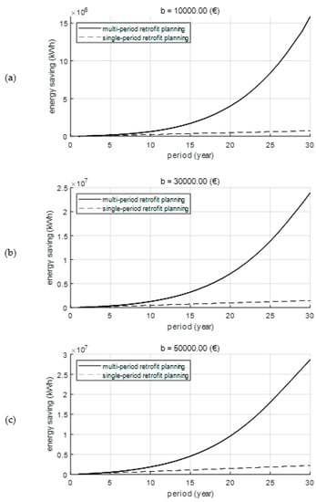 Figure 2 shows the energy savings over the analysis time window achieved by the single- and multi-period retrofit planning for different initial investment budgets. It is apparent that the multi-period planning produces significantly higher energy savings for the same initial investment budget. For instance, the initial budget = € 10,000.00 yields a total energy saving of 0.7 MWh in = 30 years by using the single-period retrofit planning. This equals about one twentieth of the total energy savings achieved in the same time window for the same initial budget by using the multi-period retrofit planning (16 MWh). Finally, Figure 2 shows (as expected) that the deviation between results in the single- and multi-period planning is more marked for longer planning windows and lower initial investment budgets.