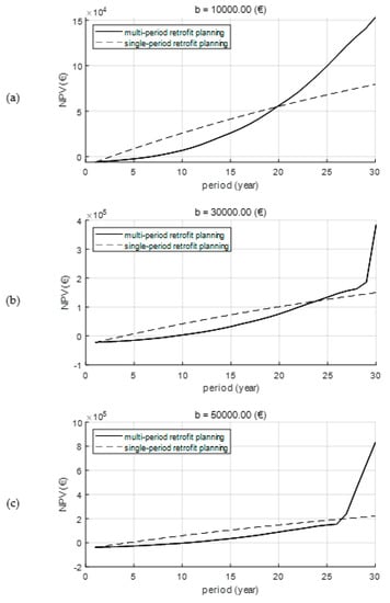 Figure 3 shows the NPVs achieved by the single- and multi-period retrofit planning for different initial investment budgets. It is apparent that, considering a short planning horizon (i.e., less than 20, 24, and 26 years for an initial investment budget equal to €10,000.00, €30,000.00, and €50.000.00, respectively), the single-period approach has a higher NPV than the multi-period planning. This is caused by the fact that in the multi-period planning approach, the energy cost savings are invested in further retrofit actions. Conversely, substantial savings are obtained in the remaining part of the planning horizon in the multi-period approach. Hence, exceeding the above identified break point, the multi-period planning produces significantly higher NPVs for the same initial investment. For instance, the initial budget = € 10,000.00 yields NPVs equal to € 75,000.00 considering a time analysis window of = 30 years by using the single-period retrofit planning. This results about half the NPVs that are achieved considering the same time window for the same initial budget by using the multi-period retrofit planning (€ 150,000.00). Finally, Figure 3 shows that the deviation between results obtained in the single- and multi-period planning is more marked for longer planning windows and lower initial investment budgets.