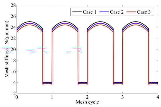 Compared to Case 1, Case 2 and Case 3 shows an obvious reduction in single stiffness and mesh stiffness according to Figure 5. Moreover, the reduction is not proportionate. Compared with Case 1, the rate of decline for Case 2 and Case 3 shows a trend of decreasing first and then increasing in a mesh cycle from coming into the mesh to going out of the mesh.