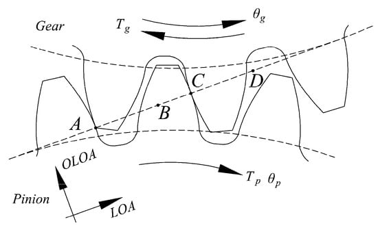 Then, the time-varying mesh stiffness can be obtained by defining two pairs of teeth in mesh. In the meshing process of a gear set with a contact ratio between 1 and 2, as shown in Figure 7, the meshing teeth pair with the contact point located between point A and point C is defined as pair #1, and the meshing teeth pair with the contact point located between point C and point D is defined as pair #2.