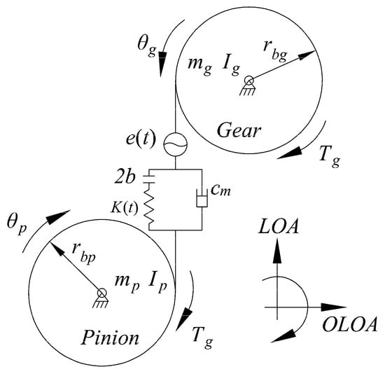 The SDOF model is shown in Figure 8. Two gears are combined with supporting shafts, which are regarded as rigid bodies with large support stiffness. The influences of friction and radial support are ignored. The pinion and gear are represented by their base circle radii of and , respectively. Then, the equations of motion can be expressed as follows: