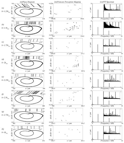 In practical engineering applications, the value range of the backlash is . Here, the research range of the backlash was expanded to to conduct a better study on the influence of backlash on the dynamics. Figure 10 shows the system response in terms of the dynamic transmission error for various backlash values. In the case of , the dynamic motion is non-harmonic-single-periodic as a whole. Partially enlarged views indicated that the system presented a low-frequency vibration, as shown in Figure 10a. The phase diagram had 16 curves, the resulting trace in the Poincare map was concentrated in 16 points, and the enlarged spectrum had peaks at the points of . As a result, the system mainly exhibited non-harmonic-single-periodic vibration and also exhibited 16T-periodic low-frequency vibration with a small amplitude.