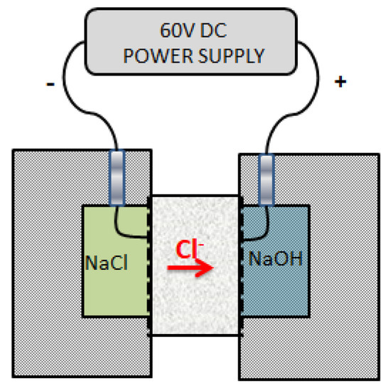 Rapid chloride ion penetrability test (RCPT) was conducted according to ASTM C1202-97 [50] using the PROOVE’it© system (Germann Instruments—Copenhagen, Denmark). It monitors the amount of electrical current passed through a 50 mm thick, 100 mm in diameter specimen, which was positioned in a measuring cell and supplied with a direct current (DC) electric current of 60 V for 6 h; the relevant apparatus is illustrated in Figure 1. In each side of the specimen rested a fluid reservoir. One reservoir was filled with 3% NaCl and was connected to the negative terminal, while the other was filled with 0.3 mol/dm3 solution of NaOH and was connected to the positive terminal of the power supply.