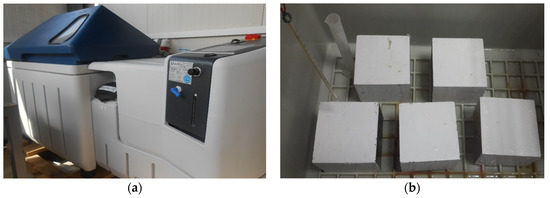 Evaluation of the chloride penetration features of nano-modified mortars was also carried out by exposing specimens to salt spray environments according to ASTM B117 [51] specifications. As laboratory conditions are much more aggressive than natural ones, to accelerate the phenomenon, severe corrosion states in short times were anticipated. Compared to other laboratory-grade accelerated corrosion tests, the salt spray test was considered more representative of the natural coastal environment [52]. Therein, after removal from the 100% humidity room, nano-modified mortars were surface dried and then naturally dried in the laboratory environment. Subsequently, they were sealed with insulating exterior paint on four sides, including the top side of the mold and two opposite open sides permitted chloride diffusion through a predefined path. Coated samples were placed in a VSC 450 salt spray corrosion test chamber (Vötsch Industrietechnik, Balingen, Germany) (Figure 2a) for 100 days, with a sealed side resting at the bottom of the chamber (Figure 2b).