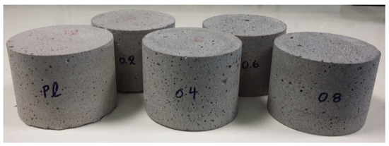 The dried mortars were prepared for testing by the following methodology. Initially, a cylindrical core of the exposed sides to the NaCl was drilled out of each cubic specimen. The diameter of the cores was maintained within 95 mm to 105 mm while sectioning of the total length provided cylindrical samples of an approximate height of about 65 mm, such as the ones shown in Figure 3.
