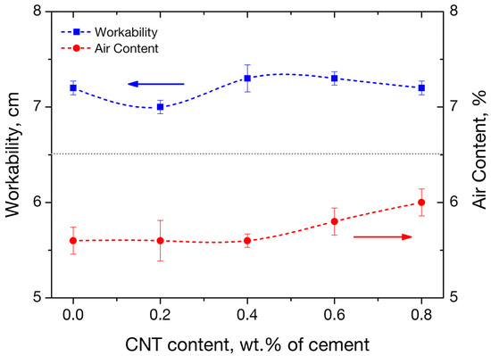 Fresh mortar properties are the ones which determine the application range of the material. During the course of the present study, workability as well as air content of the fresh nano-reinforced mortars was maintained, in similar values throughout mixtures of variable nanotube concentration, by addition of differential amounts of Viscocrete 600 superplasticizer as needed. As can be observed in Figure 4, the workability of the mortars reinforced with different concentrations of carbon nanotubes does not vary significantly from the starting, plain-mortar value. It must be recalled that the sole dispersion assistive agent used in the mixture, which affects workability, was Viscocrete Ultra 300, a native concrete additive which has proven highly effective for CNT dispersion, hence rendering surfactant usage and chemical tube functionalization, unnecessary [8,55]. The invariance of workability with respect to tube loading is a favorable finding, it ensures that the latter can act as the sole parameter responsible for any documented variation in properties.