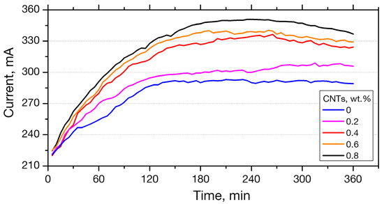 The resistance to chloride penetration was initially evaluated qualitatively using the RCPΤ method; results of current passing through nano-modified mortars with different CNT loadings after curing duration of 28 days are illustrated in Figure 5. It is therein observed that throughout the whole test duration, current was lower for plain specimens and increased with CNT concentration. The current passing through the sample with 0.8% wt. CNTs was approximately 20% higher than in the sample with no nano-reinforcement. The observed behavior is rationalized upon the anticipated increase in conductivity endowed by higher concentrations of the conductive filler and compares favorably to relevant recent findings [56,57]
