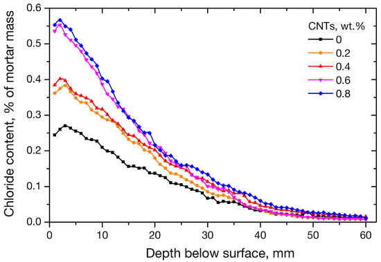 Subsequently, 1.5 g of powder ground from incrementally increasing depths inside the nano-modified material were removed using a profile grinder (Germann Instruments—Copenhagen, Denmark) and collected for chloride ion measurement. The grinding depth increment was kept as low as 1 mm, to allow for high accuracy measurement; 60 successive depths were interrogated. Next, ground powders originating from mortars with different CNT content were tested separately according to the rapid chloride test (RCT) method. In this way, the amount of chloride calculated using the RCT electrode, which was initially calibrated, was related to CNT loading. Profiles of chloride content versus the depth below the exposed surface were determined.