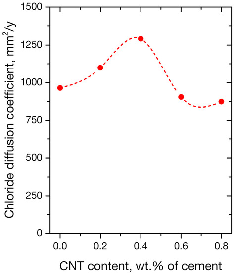 It is observed that the profiles had an almost identical shape throughout mortars of variable CNT concentration, with chloride content being at a maximum near the surface and decreasing with interrogation depth. For all specimens, the first one or two measurements, corresponding to the first two grinding steps, show less chloride ions than expected as a result of the aforementioned washout, which was performed following the exposure procedure [58]. These initial data points were not considered in the least-squares regression analysis for the obtainment of the best-fit values of the parameters of Equation (2). Moreover, it is observed that after the first 50 mm below the exposed surface, ion content drops to less than 0.05% where nanotube presence does not make a difference to the total recorded behavior. Most importantly, at all depths, chloride content was consistently higher for samples with higher CNT concentrations, a finding which signifies that chloride ion concentration is directly affected by nanotube presence. According to Figure 7, the influence is moderate for CNT loadings of 0.2% and 0.4% wt. of cement and more intense in mortars loaded with 0.6% and 0.8% nanotubes. Chloride concentration in mortars with 0.8% wt. cement CNTs is almost 50% higher than that of plain mortars. It is believed that after drying the mortars that were exposed to salt spray, chloride ions are still present in the cement matrix, although the network of pore water which initially carried them and acted as an electrical pathway, is now removed. Resultant chloride-containing crystals are electrically conductive and are now precipitated between networks of conducting carbon nanotubes. This facilitates electrical current flow through the material and absorption of a considerable amount of chloride ions. Inarguably, bigger amounts of chloride ions manage to travel effectively and are trapped to the inner part of the structure as CNT concentration increases. The chloride diffusion coefficient values calculated for nano-modified mortars exposed to 5% NaCl solution following the analysis presented in Section 2.3.2 are shown in Figure 8. It is therein observed that the coefficient increases for the first two nanotube loadings and is at a maximum at a CNT concentration of 0.4% wt. of cement above which it drops again by approximately 30% of the maximum value, to the level of the plain specimens or slightly lower. Joining information from Figure 7 and Figure 8, it can be argued that higher chloride diffusion coefficient values do not necessarily signify larger amounts of chlorides penetration in the specimen. This is because the coefficient expresses how fast the chlorides are transported in the material and depends on external factors such as the degree of hydration and saturation, as well as porosity.