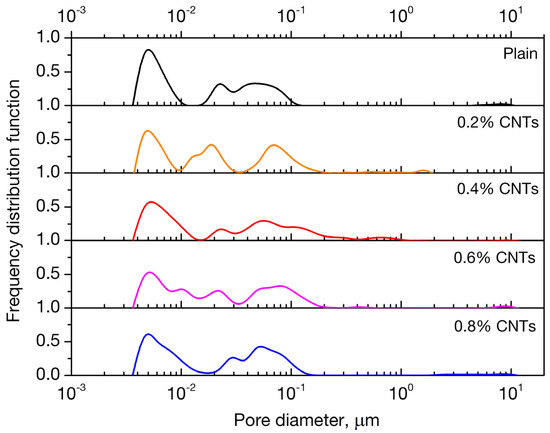 The pore size distributions measured by mercury porosimetry in mortars with variable carbon nanotube contents are presented in Figure 9. It is therein observed that all mortars exhibited overall comparable pore distribution curves with the main features being (i) the dominant peak at ca. 6 × 10−3 μm, on 6 nm, which is fixed throughout variable nano-inclusion concentrations and is inarguably attributed to intra-nanotube porosity, i.e., the over volume corresponding to the internal open space of the cylindrical multi-walled tubes, and (ii) a pore range of non-consistent peaks up to 0.2 μm.