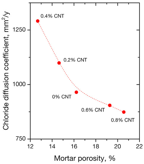 Additionally, chloride diffusion coefficients of corroded mortars are plotted as a function of respective mortar porosity in Figure 10. An inverse correlation between the two parameters is therein observed, with diffusion coefficients values decreasing with total porosity. This finding can be rationalized upon considering that more porous microstructures can block the rate of chloride penetration inside the testing mortars.