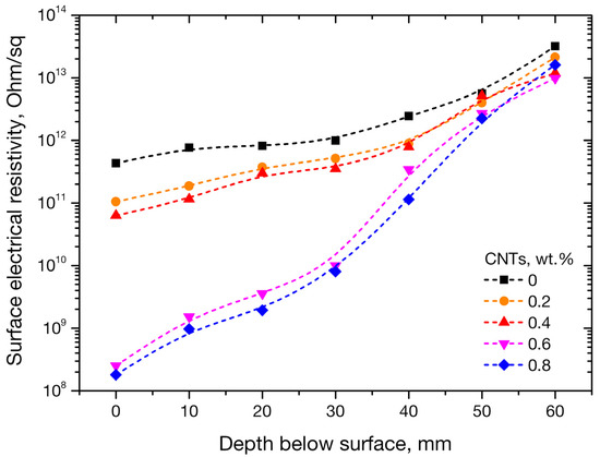 The effect of salt spray (fog) corrosion test on the mortars’ electrical properties was investigated by measurement of surface electrical resistivity at successive depths inside the ground mortars, with a step of 10 mm, as shown in Figure 11. The depicted changes in electrical resistivity at successive depths below the exposed surface are indicative of physical and chemical changes taking place into the material [33]. Specimens with 0%, 0.2% and 0.4% nano-inclusion concentrations, demonstrate a gradual increase in surface electrical resistivity with interrogation depth and reach, at a depth of 60 mm, a practically common value. This indicates the absence of chloride ions at such depths, independently of the concentration of nano-inclusions in the compositions. On the other hand, resistivity in samples with 0.6% and 0.8% nano-inclusion concentrations commences at the surface with significantly lower values than in the previous case, and follows a gradually increasing trend with depth, until it catches up with the behavior of the lower CNT concentrations. This may be attributed to the electrical percolation threshold of the nano-modified mortars wherein a conductive filler concentration of 0.6% wt. cement CNTs is already sufficient for the creation of a conductive electrical path [2]. Electrical resistivity appears to increase with interrogation depth below the exposed surface, which indicates that chloride concentration decreases with depth. On the contrary, porosity is one of the main parameters affecting the electrical resistivity in a cement-based material. The lower porosity values of specimens with 0.6% and 0.8% wt. to cement carbon nanotubes (Table 2), may indicate that the electrical current takes the path of least resistance inside the specific structures.