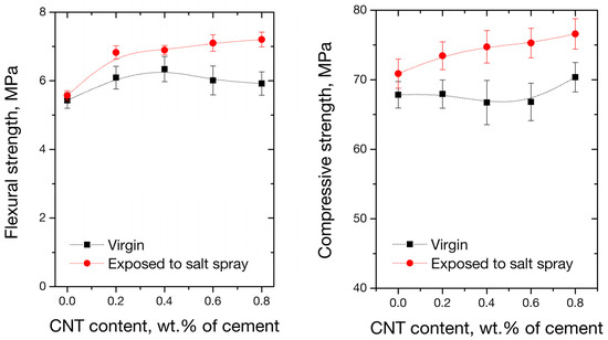 The effect of carbon nanotube concentration on the flexural and compressive strengths of the nano-modified mortars, both before and after exposure to salt spray conditions for a duration of 100 days, is presented in Figure 12. Virgin samples exhibited negligible fluctuation of the compressive strength with respect to CNT content, while flexural strength showed a small increase up to 0.4% CNT loadings. These findings compare favorably with previous research dedicated to the mechanical properties of CNT-modified mortars [8]. It is observed that exposure to sea fog resulted in improved flexural and mechanical properties for all specimens, irrespective of nanotube concentration. Concerning flexural strength, the property appears to increase by approximately 10%, commonly for mortars with CNT concentrations up to 0.4 wt. %, as a result of exposure to NaCl. The highest increase with respect to unexposed specimens is 22% and is noted for mortars with 0.8 wt. % nanotube content. These results are not incompatible with the porosimetry findings, wherein the inner pores of the specimens are filled with salt from the water solution that mortars are subjected to. Because of the lower porosity of the specimens with 0.6% and 0.8%, the percent increase of flexural strength of the specimens up to 0.4% nanotube concentration is greater. On the other hand, compressive strength appears to increase after the exposure to salt spray conditions for all the investigated ranges of carbon nanotube loadings and is generally constant at about 10%.