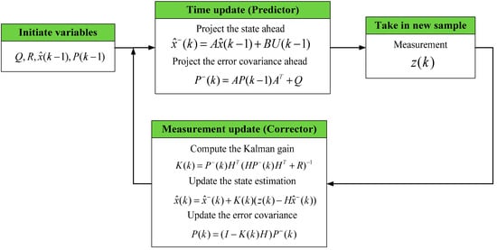 Figure 1 presents the structure of Kalman filter algorithm in which the estimated state  and the error covariance P(k − 1) are included []. As shown in Figure 1, The Kalman filter algorithm consists of two phases: time update phase (predictor) and measurement update phase (corrector). The following summarizes the two important phases in classical Kalman filter algorithm.