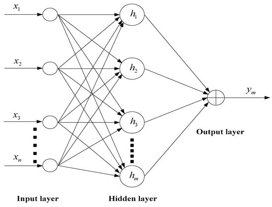 Figure 2 presents the structure of a classical RBFNN. This feed forward multilayer neural network has three layers, comprising the input layer, hidden layer and output layer. As shown in Figure 2, the inputs of the hidden layer in the RBFNN structure are the linear combinations of the weights and the input vector . These vectors are then mapped by means of a radial basis functions in each node. Finally, the output layer of RBFNN generates a vector  for m outputs by linear combination of the outputs of the hidden nodes. This kind of artificial neural network has been regarded as a powerful tool that can approximate any continuous function with satisfactory accuracy []. In Figure 2, the output of the RBFNN is expressed by: