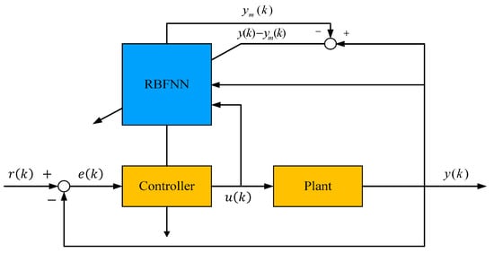 Figure 3 depicts the block diagram of the RBFNN-based control. In Figure 3, the error between the real output y(k) and the estimated output of the neural network  are considered to develop a self-learning RBFNN. The cost function or performance index is defined by the squared estimation error: