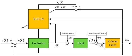 Based on Figure 3, the proposed KF-RBFNN control scheme depicted in Figure 4 considers the process noise w(k) and measurement noise v(k). In the proposed intelligent KF-RBFNN control scheme, the KF-RBFNN serves as an on-line learning and adapting mechanism in the intelligent controller. As shown in Figure 4, the effects of the process uncertainty w(k) and the measurement noise v(k) in the control scheme can be reduced via the implementation of the Kalman filter. To retrain the uncertainty and noise, the measured output z(k) is employed to derive an estimation  of the output y(k) in the proposed KF-RBFNN. Both the control signal u(k) and output  of the RBFNN are fed into the neural network for on-line learning. Moreover, the estimated output value  of the RBFNN is then utilized to update the control parameters to achieve self-learning control using the Kalman filter.