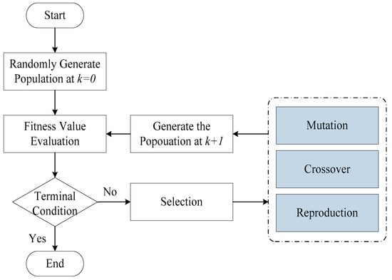 The GA developed by John Holland is a search algorithm that is inspired by Charles Darwin’s theory of natural evolution. This evolutionary algorithm reflects the process of natural selection where the fittest individuals are selected for reproduction, thereby producing offspring of the next generation. This stochastic optimization technique starts with a set of solutions (chromosomes), called a population. This paradigm employs probabilistic rules to evolve a population from one generation to the next via the genetic operators: reproduction, crossover, and mutation. This paradigm is widely used to solve multidimensional optimization problems. When applying a GA to deal with optimization problems, an initial population of feasible solutions is generated. Each feasible solution is encoded as a chromosome string. These chromosomes are evaluated using a predefined fitness function or objective function based on the optimization problems. Figure 5 presents the flowchart of a GA. The initial population is randomly generated and the fitness function is defined before the GA evolutionary process begins. This study employs tournament selection, single-point crossover and single-point mutation strategies to develop a modified GA paradigm.