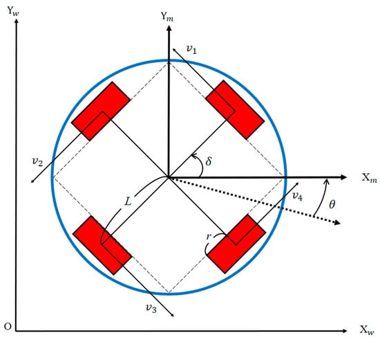 is ; r represents the radius of the Swedish wheel; L denotes the distance from the Swedish wheel’s center to the geometric center of the mobile robot;  and  respectively denote the linear and angular velocities of each omnidirectional wheel.  is the pose vector that includes the position and orientation of the mobile robot measured at time t.