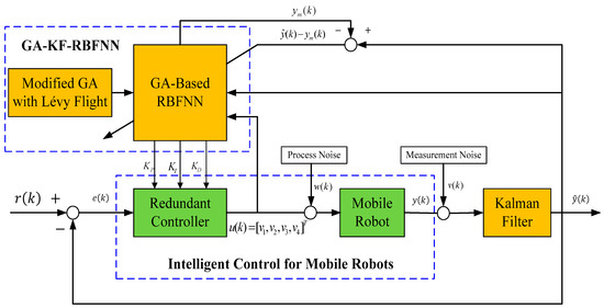 Figure 7 depicts the GA-KF-RBFNN self-learning control scheme, in which the noise from the process and measurement phases are included. As shown in Figure 7, the proposed GA-KF-RBFNN is employed to online adjust the parameters  , and  of the mobile robot. It is worthy to mention that the control matrices in Equation (17) are online adjusted at every sampling point to achieve tracking control. This GA-KF-RBFNN evolutionary online tuning method with noise reduction outperforms the traditional off-line and hand-tuning approaches.
