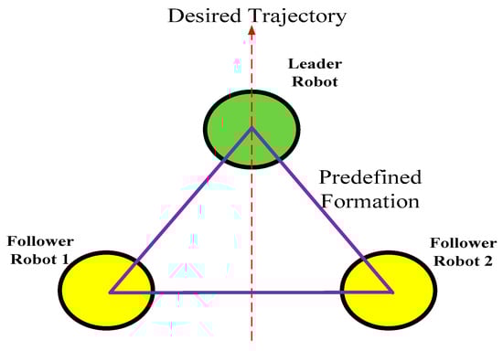 The leader-follower model is the main trend of networked mobile robotics, where a leader robot and several follower robots are included in a multi-robot system []. For networked mobile robots, formation control is an important topic that the leader robot tracks the desired trajectory while the follower robots maintain the formation shape. Figure 8 depicts a leader-follower networked mobile robotic system to achieve triangular formation control with three robots.