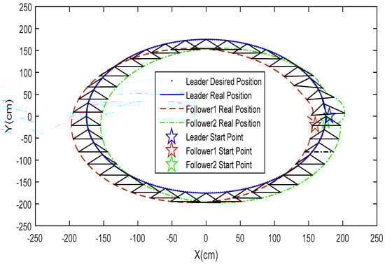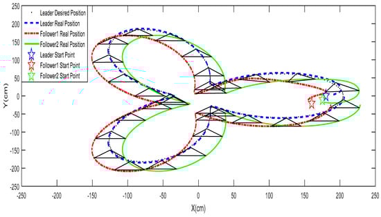 This section aims to conduct several simulations to examine the effectiveness of the proposed methods. The proposed networked mobile robot system consists of three four-wheeled Swedish omnidirectional mobile robots, including one leader and two follower mobile robots in a broadcast communication environment. The desired formation shape is triangular as shown in Figure 8. The system parameters in the proposed networked mobile robot system are L = 0.25 m and r = 5.08 cm.
