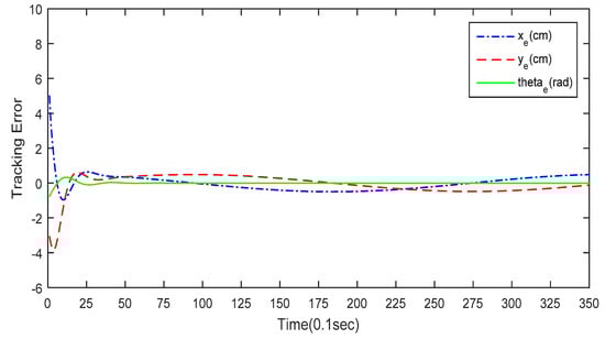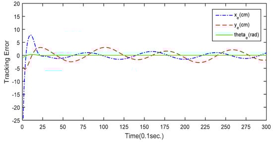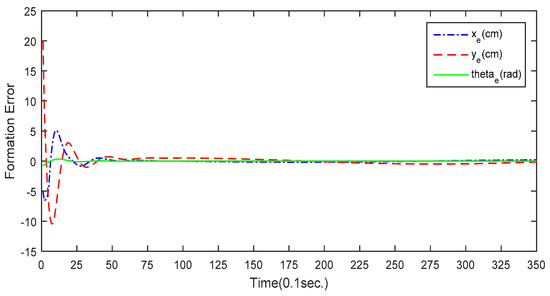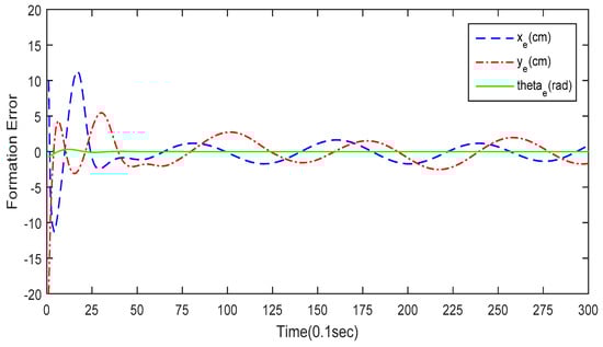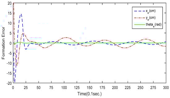 The first simulation is conducted to demonstrate the performance of the circular formation control using the proposed GA-KF-RBFNN control approach. The number of iterations for the modified GA is 150, and the probabilities of crossover and mutation are determined by the Lévy flight. The circular trajectory for the leader robot is expressed as  . Figure 9 depicts the simulation result of the circular formation control. The three omnidirectional mobile robots are initially placed at different poses in the workspace. The desired trajectory for leader robot is a circular trajectory and the two follower robots aim to maintain a triangular formation. The tracking error of the leader mobile robot is presented in Figure 10. As shown in Figure 10, the leader mobile robot successfully tracks the desired circular trajectory in 4 s. Figure 11 depicts the formation error of follower robot #1 and Figure 12 depicts the formation error of follower robot #2. These simulation results demonstrate that the proposed GA-KF-RBFNN optimization is capable of accomplishing the self-learning formation control of networked mobile robotic systems.