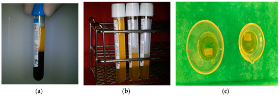 The separation of plasma components upon centrifugation and subsequent PRGF (fraction 3) separation by pipetting, followed by immersion of membranes in PRGF, is represented in Figure 1a–c. The hematological parameters were determined in whole blood and PRGF fraction by hematology analyzer and presented comparatively in Table 1. In order to assess the quality of PRGF, the expression level of the main growth factors are presented in Table 2. Quantitative data in both tables are expressed as mean ± standard deviation.