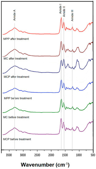 ATR FTIR (Attenuated Total Reflection Fourier Transform Infrared) spectra of commercial collagen membranes for bone-guided regeneration before and after PRGF treatment. Legend: Biocollagen® = MCP; CovaTMMax = MPP; Jason® = MC.