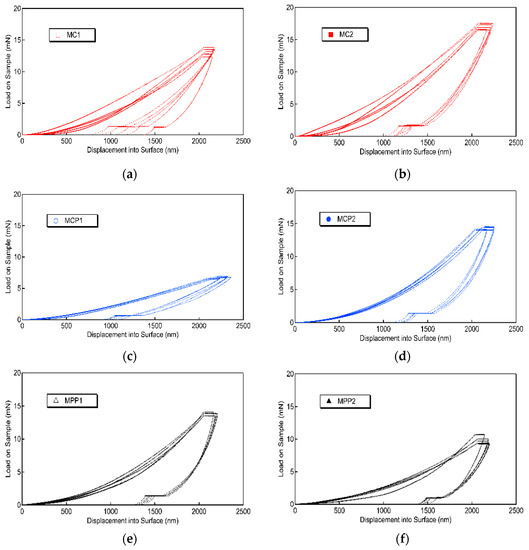 Nanoindentation measurements: load–displacement curves recorded for each membrane before (a,c,e) and after (b,d,f) PRGF treatment. The images correspond to Jason® (a,b), Biocollagen® (c,d), and CovaTM Max (e,f). Legend: MC1/MC2 = Jason® membrane before/after PRGF treatment; MCP1/MCP2 = Biocollagen® membrane before/after PRGF treatment; MPP1/MPP2 = CovaTM Max membrane before/after PRGF treatment.
