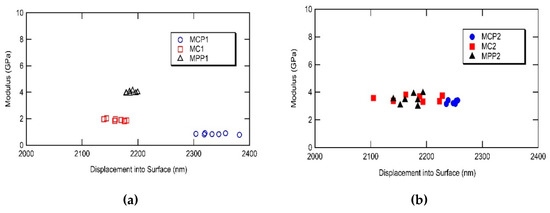 Young modulus calculations with respect to the three collagen membranes before (a) and after PRGF treatment (b). Legend: MPP1/MPP2 = CovaTMMax membrane before/after PRGF treatment; MC1/MC2 = Jason® membrane before/after PRGF treatment; MCP1/MCP2 = Biocollagen® membrane before/after PRGF treatment.