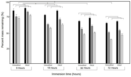 The enzymatic (trypsin) degradation test also emphasized different behaviors of the membranes with or without PRGF treatment. As a general behavior, PRGF-modified membranes exhibited a slower degradation compared with the native ones, in all the three cases.