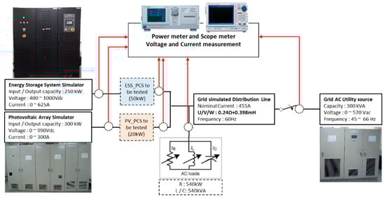 In this work, the experimental circuit was configured as shown in Figure 3 to test islanding detection while two inverters (PV inverter and EESS inverter) were operated. The DC power source, which can be operated in constant voltage (CV) mode (red dotted line), can supply power and consume the load like a battery system. Tests were carried out under the condition that the quality factor was one, not under a variety of conditions. Equation (1) shows how the quality factor is calculated: