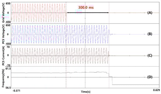 Figure 6 shows the resultant waveform for testing under EESS inverter-operated discharging mode with 20 kW output power to the grid utility section. The RLC loads were the same as for the PV inverter testing. The time taken for the inverter to stop was approximately 300 ms. In the case of the EESS inverter, the method of detecting whether the frequency was changed was by injecting reactive power at every specific period. The injection period for reactive power of the EESS inverter was about 300 ms, such as for the frequency waveform in Figure 6. In comparison to the previous test results, the islanding detection method of the inverters of manufacturer A and B was different.