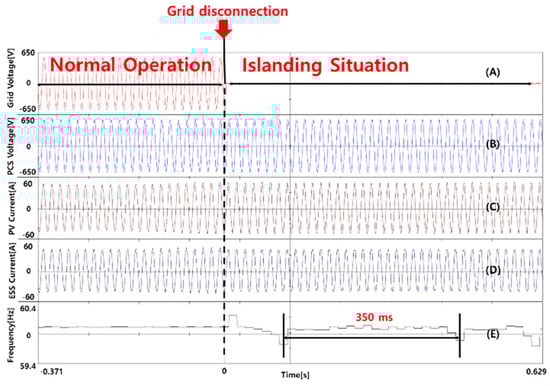 Figure 7 shows the experimental results for case 3 in Table 4. (A) is the waveform for the voltage of the grid utility side, (B) is the waveform for the inverter output voltage, (C) is the waveform for the inverter output current of manufacturer A, (D) is the waveform for the inverter output current of manufacturer B, and (E) is the waveform for frequency. For the islanding detection testing, the PV inverter was operated at its rated power of 20 kW, and the inverter for the EESS was operated simultaneously in a 20 kW discharge mode. Then, the R-load (40 kW), L-load (−40 kVA), and C-load (40 kVA) were connected in an islanding condition. Although the switch of the grid utility was shut off, the inverters failed to detect the islanding and continuously supplied power to the RLC loads. Therefore, the inverters were manually stopped. The frequency waveform in Figure 7 shows that the two inverter frequencies were combined under the islanding condition. The EESS inverter injected reactive power to detect islanding approximately every 350 ms and this showed that the frequency fluctuated. The islanding detection failed because the frequency change value fluctuated within 5% of the cutoff frequency.