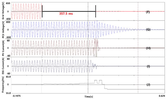 Figure 8 shows the waveforms of the experimental results for islanding detection when the PV inverter was operated at a rated power of 20 kW and the EESS inverter was operated in charging mode at 20 kW. The RLC capacities were 0 kW of R-load, −20 kVA of L-load, and 20 kVA of C-load. The test time for anti-islanding of the inverters was recorded when islanding occurred after the circuit breaker of the grid side shut off. The time until the inverters stopped was approximately 357.5 ms and the inverter normally detected the islanding. Islanding detection was possible when the output power of the PV inverter was the same as the charging power of the EESS inverter. In this case, the PV inverter stopped due to an overcurrent error from an insulated-gate bipolar transistor (IGBT) component.