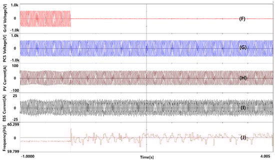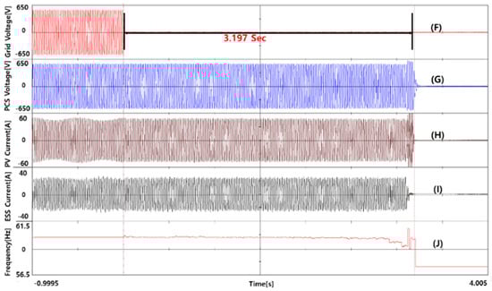 Figure 9 shows the resulting waveforms when the PV inverter was operated at its rated power of 20 kW and the EESS inverter was operated at 10 kW output power in charging mode. This experiment simulated a state with a power load of 10 kW because the EESS inverter operated as if it was consuming the R-load. The RLC load capacities were 10 kW of R-load, −20 kVA of L-load, and 20 kVA of C-load. The time to stop was 3.197 s and the inverters failed to detect islanding within this time. Case 5 was different from case 4 because there was an R-load. It is estimated that the islanding detection time was later than case 4 due to the R-load. When the EESS was in charge mode, it functioned as an electronic load and consumed the power generated by the PV system; the R-load also consumed the power of the PV system.