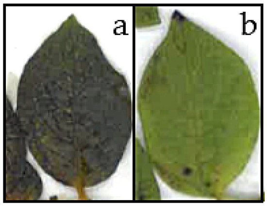 Leaflets of S. tuberosum leaves subjected to a controlled freezing treatment down to −3.0 °C either (a) inoculated with ice or (b) kept supercooled. Digital images were taken 4 d after the low temperature treatment.