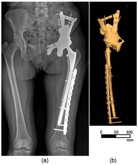 - Wong, K.C.; Kumta, S.M.; Geel, N.V.; Demol, J. One-step reconstruction with a 3D-printed, biomechanically evaluated custom implant after complex pelvic tumor resection. Comput. Aided. Surg. 2015, 20, 14–23. [Google Scholar] [CrossRef] [PubMed]