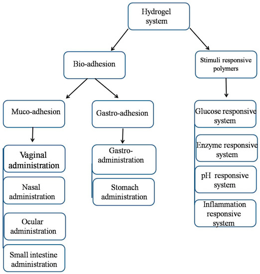Efficient delivery systems have been developed based upon on the understanding of their interactions with the biological environment, target cell population, target cell surface receptors, changes in cell receptors that occur with progression of disease, mechanism and site of drug action, drug retention, multiple drug administration, molecular mechanisms, and pathology [17]. For these reasons, many reports have referred to bio-adhesive polymers as promising materials that should be integrated into the moieties of nanoparticles [18]. This is in part due to their reactive potential and good penetration into stomach and mucosal layers. Bio-adhesive polymers are classified according to their interactions with biological systems into subgroups: mucoadhesive polymers which can penetrate mucus layers (e.g., ocular, nasal, vaginal, and small intestinal); gastro-adhesive polymers which can adhere onto stomach lining; and stimuli responsive polymers which can react to biological stimulants (e.g. glucose, enzymes, pH, and inflammation) (Figure 1) [19]. In addition to tablets, patches, gels, ointments, and film formulations; mucoadhesive nanoparticles have emerged recently to improve the controlled delivery of drugs. For nasal, vaginal, ocular, and oral administration, many nanoparticles have been optimized to possess mucoadhesive properties [20,21,22].