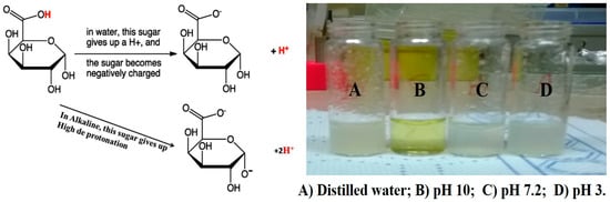 Polygalacturonic acid (PgA) is a natural polymer with a heterogeneous structure bonded via α (1,4) glycosidic linkage. Hanafy and his colleagues have demonstrated that PgA has limited dissolution in distilled water, Phosphate buffer saline (pH7.3), and acidic distilled water (pH3), resulting in white turbidity (Figure 3) [49]. This result is consistent with its hydrophobic properties [50]. PgA is not degraded in the upper gastrointestinal tract due to its insolubility in acidic conditions [51]. However, PgA can be dissolved in alkaline distilled water (pH 10), exhibiting a translucent yellow-green color. This means it can be hydrolyzed in the high pH environment of the colon. The cause of this dissolution is related to the pKa of its carboxyl group, i.e., at low pH it is protonated and the polymer is insoluble, while it is deprotonated at higher pH leading to polymer dissolution [52]. It is reported that the combination of PgA with a second polymer into a composite may alter the degree of swelling and can change its mechanical properties [53], improving both the stability of encapsulated drugs and the control of their release.