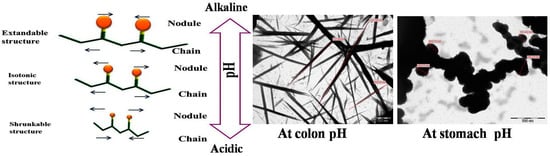 Poly(acrylic acid) (PAA) is a hydrophilic polymer [56] that adopts a random coil conformation in solution. In their recent work, Hanafy and his colleagues have further demonstrated that these coils have swelling properties under certain ionic strengths and salt concentrations, leading to extended chain conformations in alkaline solutions (Figure 4) [49,57,58,59]. This is due to the COOH side chain which is pH responsive, i.e., protonated (COOH) at pH ≤ 5 while de-protonated (COO–) at pH > 5 [60]. In aqueous media of appropriate pH and ionic strength, the carboxylic groups ionize and develop fixed charges on the polymer network, generating electrostatic repulsive forces responsible for pH-dependent behavior, causing swelling or shrinking of the hydrogel structure [61]. PAA is expected to form a hydrophilic corona. While in alkaline pH, the interaction of the swelling coils of PAA with water makes it more favorable for protection, as it adsorbs water at a weight many more times than that of its own. [62,63]. Additionally, PAA is poorly soluble in water at low pH, causing structure shrinkage. This mechanical elasticity is predicted to protect the micelles during oral administration and through the gastrointestinal tract.