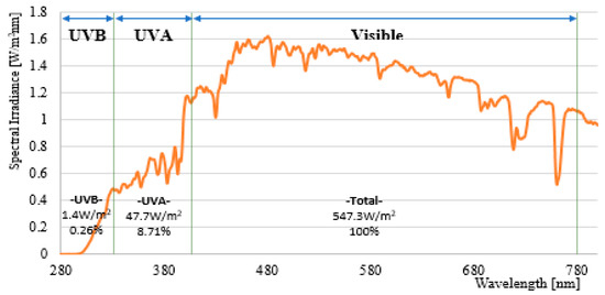 UVA and UVB are components of UV rays that have different levels of effects on the human body [30]. The local solar UV irradiance was measured and analyzed to provide a typical solar irradiance used to calculate UV exposure. Measurements were taken at a latitude of 36.85 and a longitude of 127.15 on the roof of a 10-story building to minimize shadow interference. The spectral irradiance was measured at noon on a clear day in summer since it would be advantageous to identify the characteristics of UV light under strong sunlight. The measurement was conducted on 21 July 2018, and the concentrations of the fine dust were 76 μg/m3 for pm10 and 50 μg/m3 for pm25, which are “normal” levels (according to the Korea Meteorological Administration). A spectrometer (CAS 140CT 152) capable of measuring spectral irradiance in the range of 200–800 nm was used as the measuring instrument. Its specifications are shown in Table 1. In addition, the results of the measured natural light are shown in Figure 1.