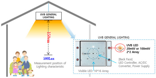 IEC 62471 states that the stability evaluation of general lighting must be measured at an illuminance of 500 lux [27]. Further, considering that the average ceiling height of houses, apartments, and offices are 2.4–2.8 m, general lighting should be able to provide a brightness of 500 lux at a distance of 1.5 m. To this end, white multi-channel LEDs are used for such purposes. UVB LED light sources were utilized to provide UVB doses that are beneficial to the human body. LEDs can control the optical characteristics by adjusting the applied current output. LED light sources may be combined to form various types of lighting. Based on these characteristics, to control all LED light sources, a controller was developed so that the desired brightness and the UVB dose could be achieved. Figure 2 outlines the proposed lighting.
