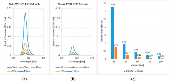 For the experiment, two test lighting modules combining 10 light source modules (each 20 mW UVB led or 100 mW UVB led) were developed. The light characteristics of the two UVB LED light source modules were measured from distances of 30, 60, 50, 90, and 150 cm, and the results are shown in Figure 3.